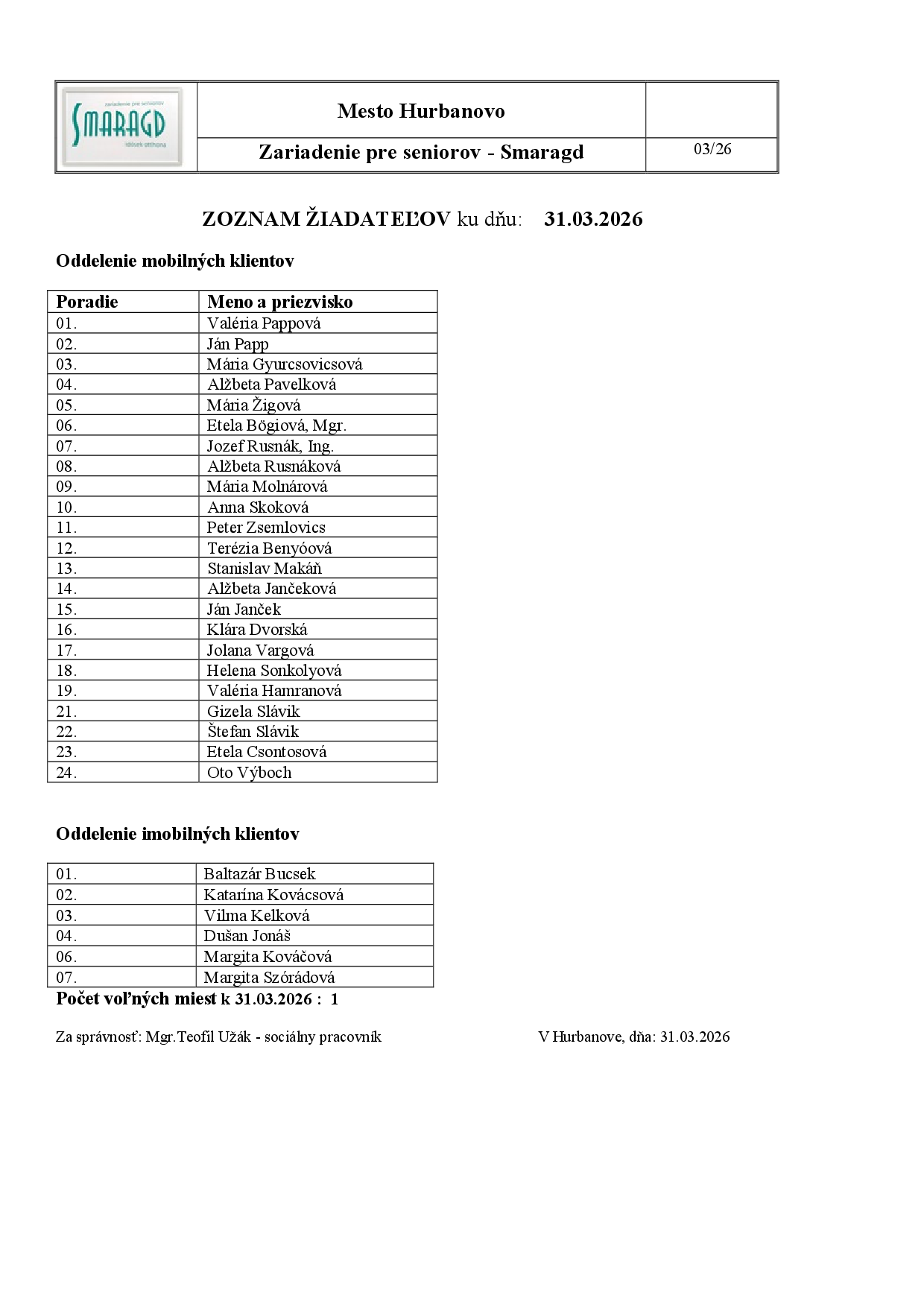 Zariadenie pre seniorov SMARAGD Hurbanovo zverejňuje zoznam žiadateľov o poskytovanie sociálnej služby evidovaných ku dňu 31.03.2026 nasledovne: